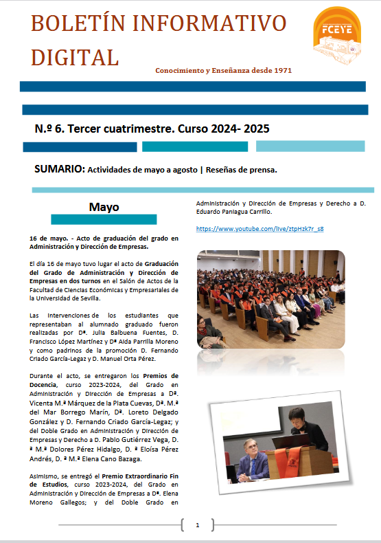 Desde la Facultad de Ciencias Económicas y Empresariales, queremos compartir la difusión, en formato digital, de nuestro nuevo Boletín Informativo que se emitirá con una periodicidad cuatrimestral y que recogerá los eventos más destacados en nuestro centro a lo largo del cuatrimestre correspondiente.